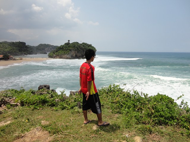 sekitar jam, sampai juga di pantai Drini..cuaca cerah nampak setelah markir kendaraan..dan adek pun langsung jalan ke arah timur..maklum dia udah lama nggak ke pantai di gunkid, mungkin satu setengah taun ada.. π