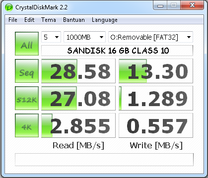 menurut crystaldiskmark, kedua microSDHC ini sesuai spesifikasi dimana kelas 10 berarti kecepatan tulis minimum berurutan adalah 10MB/s.. secara umum Samsung lebih cepat daripada Sandisk.. namun, keunggulan Samsung cukup tipis, kecuali kemampuan menulis acak 512 KB, dimana perbandingannya cukup mencolok.. hanya saja, hasil uji kecepatan SanDisk boleh dibilang cukup oke karena mendekati klaim kecepatan baca 30 MB/s..
