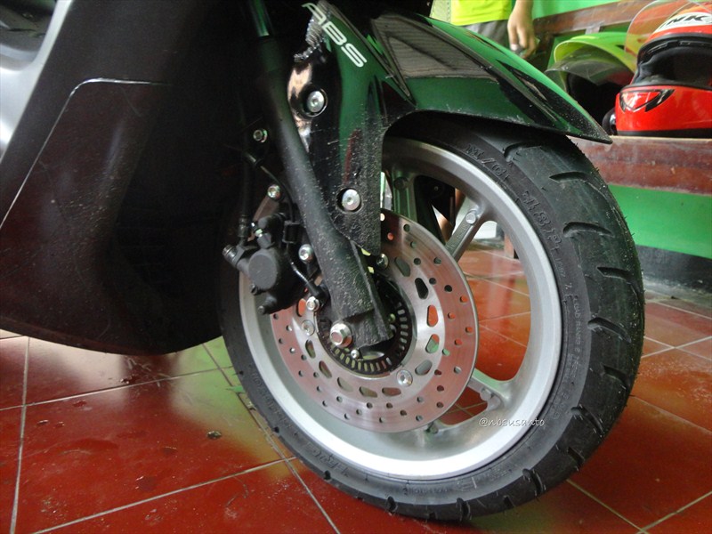 yamaha nmax menggunakan ban dengan diameter tidak lazim jika melihat motor lain pada masa kini, yaitu ring 13.. ukuran ban depan yamaha nmax adalah 110/70-13, sementara itu ban belakang berukuran 130/70-13.. yamaha nmax menggunakan peranti rem cakram untuk roda depan mauoun belakang.. kemudian, pengereman menggunakan teknologi ABS yang dikenal mempunyai nilai tambah dalam pengereman..