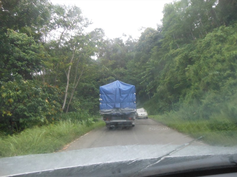 saat tadinya tercecer masih melalui pemukiman atau persawahan kondisi aspal masih lumayan bagus.. tapi di suatu daerah baru terasa greget.. perlahan pohon di tepi jalan semakin rimbun.. yap, memasuki kawasan hutan.. suasana sore hari diguyur hujan menambah suasana gelap.. jalanan menyempit, aspal rusak.. yang kami temui biasanya truk besar penggerak 6×4.. Β kombinasi tikungan dan tanjakan-turunan menambah warna sore itu.. tidak salah lagi, ternyata sudah memasuki kawasan taman nasional bukit barisan selatan.. π
