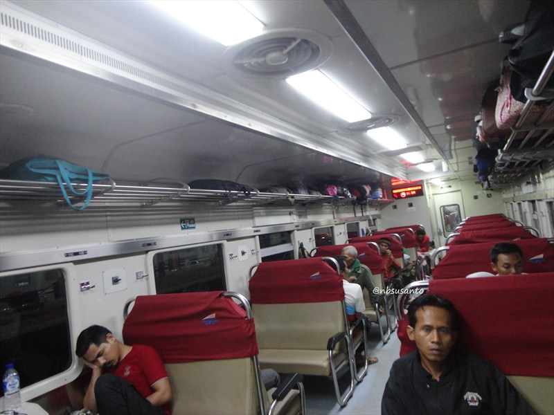 interiornya juga sama saja dengan Gajahwong maupun Bogowonto.. hanya ada kain di ujung atas setiap kursinya.. busa seadanya dan tentu tidak bisa reclining seat.. kalo AC juga lumayan lah.. tempat menaruh barang dan centelan pun sama saja.. memang tipikal kereta ekonomi yang setiap gerbong (sebenernya gerbong sebutan untuk kereta barang, untuk kereta penumpang ya gerbong adalah kereta, tapi sudah terlalu umum disebut gerbong) berisi 80 orang..