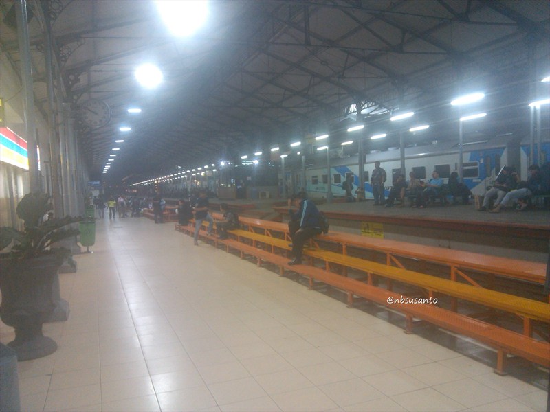 beda 5 ribu dengan kereta kelas bisnis Senja Utama paling mahal.. bahkan lebih mahal dibanding harga batas bawah Taksaka yang kelas eksekutif.. tapi mau gimana lagi.. jam yang paling masuk akal ya kereta ini.. mau naik Bogowonto pasti nunggu kelamaan karena temen di jakarta yang dijadikan tempat nginep juga belum pulang kerja.. ya sudah.. kereta dijadwalkan datang di Lempuyangan 12.28 dan berangkat 12.43 kemudian sampai di Jatinegara 21.42.. beli makanan di luar stasiun dan boarding sejam sebelumnya.. eh ndilalah diumumkan kalo mengalami keterlambatan kedatangannya delay..