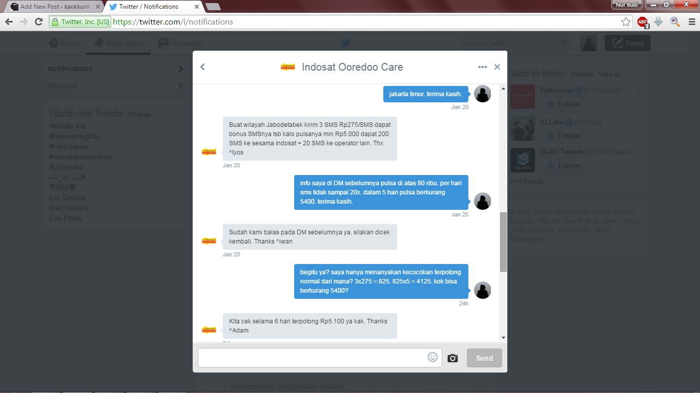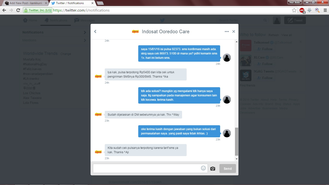 Indosat.. operator lokal yang pada tahun ini nbsusanto mencapai usia ke 10 bersamanya.. dengan produk andalan IM3 dan Mentari tentu sudah banyak ceritanya.. dari kirim 10 bonus 10 dengan tarif 150 rupiah per sms.. nomer trobel dibawa ke CS.. hingga sekarang namanya ketambahan Ooredoo.. namun kemarin nbsusanto komplain karena bonus sms tidak diberikan dan malah tarifnya aneh.. kemudian DM ke @IndosatCare tanggapannya sangat mengecewakan seperti berikut..