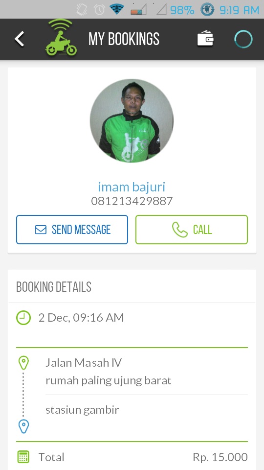 kemudian ada tanda proses pembookingan sedang berlangsung.. muncul nama driver dan nomer telponnya.. dilihat di aplikasi, driver tersebut memang sudah mendekat, dan beliau pun telpon untuk memastikannya.. ya walaupun nggak sampe di rumah tempat nbsusanto menunggu, maklum gangnya kecil, jadi di ujung gang.. daripada malah kelamaan ya sudah samperin kesana.. maklum keburu-buru.. 🙄