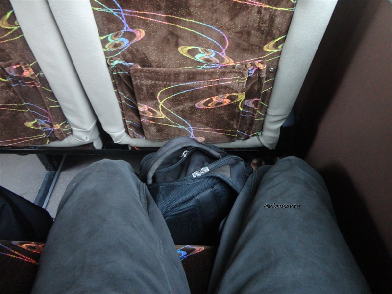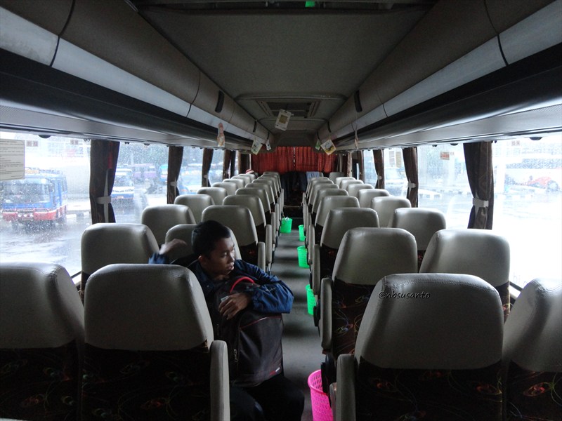 seperti biasa pilih kursi dekat jendela.. berhubung masih banyak yang kosong pilih baris ketiga.. ideal sih walau kadang kalau naik bis pengen nyobain hotseat.. :mrgreen: dipeseni untuk siap sebelum jam 14.00 karena bus akan berangkat jam 2 siang.. walau begitu, di H-2 belum ketauan no bus nya.. disuruh balik lagi di hari H sebelum keberangkatan.. ๐Ÿ™„
