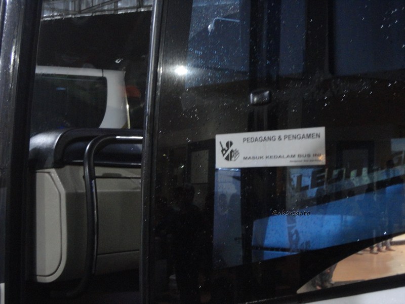 hal yang cukup mengganggu saat masuk di terminal ada pedagang dan pengamen yang masuk ke bus.. padahal di pintu sudah tertempel stiker yang jelas melarang masuknya pedagang dan pengamen ke dalam bus sinar jaya.. iki piye to? asembuhlah.. menolak dengan halus orang yang jualan dan cuek saja kalo ada pengamen yang menyodorkan tampungan uang.. ๐Ÿ˜ˆ