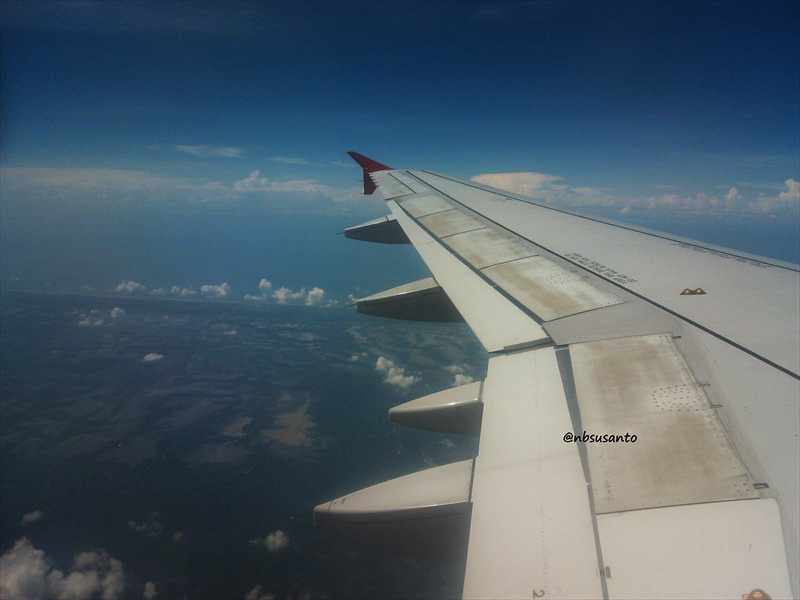 awalnya bingung dimana terminal B.. maklum diantarkannya ke tempat biasa drop off penumpang adisucipto.. yap di terminal A.. dan ternyata harus jalan kaki ke barat ke arah terminal B.. waktu itu memang informasi mengenai terminal B masih kurang kalo menurut nbsusanto.. π ya sudah jalan ke terminal B, selesai urusan check in danΒ boardingΒ langsung jalan ke arah pesawat.. nggak bawa bagasi jadi nggak ribet.. nah di adisucipto belum ada garbarata, jadi ya jalan kaki.. foto di atas setelah take off dari adisucipto.. posisi jendelanya pas dan bentuk sayapnya pun fotogenik.. π