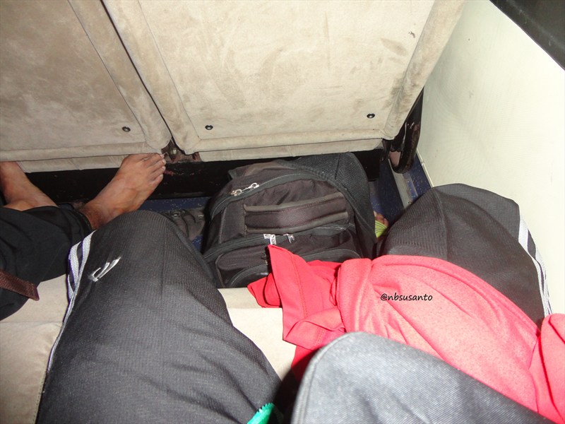 ngomongin tentang kaki, ruang kaki cukup lega lho! ditaruh tas ransel dan kaki masih di posisi yang nyaman.. cuma nggak ada tempat seperti saku di jok di depannya untuk sekadar naruh air minum atau apapun..