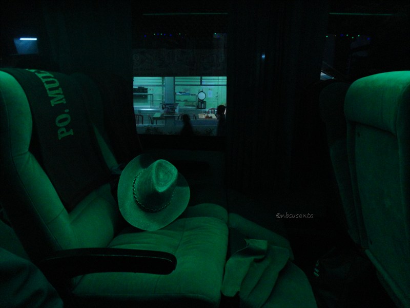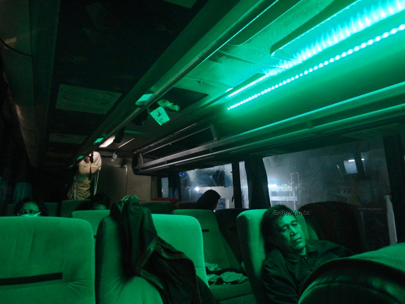 standar bus masa kini, jok sudah reclining seat.. oya, seperti hasil nbsusanto gugling sebelumnya, di kelas VIP pun sudah ada sandaran kaki dan selimut.. waiki.. lumayan.. walau saat nbsusanto coba kok sandaran kaki selalu turun.. lama ngutak atik akhirnya ketemu ada sebatang besi di tengah bawah yang harus diatur.. ooo, jadi cuma ada opsi sandaran kaki naik tanpa bisa diatur ketinggiannya.. berhubung nbsusanto bawa ransel, jadi tak terpakai itu sandaran kaki.. sayangnya sih posisi kepala tak senyaman saat naik Sinar Jaya kemarin.. πŸ™„