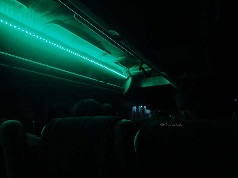 naik ke bus yang langsung dilihat adalah di belakang, eh ada toiletnya.. lumayan.. nggak selalu terpakai, tapi berhubung nbsusanto memperkirakan jalanan cukup padat karena arus balik maka toilet akan jadi nilai tambah, jaga-jaga kalo perjalanan lebih dari 15 jam.. di dalam bus ada TV berukuran besar dan antena yang dalam perjalanan malam itu tak sekalipun dinyalakan..