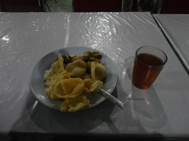 ambil makanannya prasmanan, kecuali daging ayam disendokkan oleh petugasnya.. wajar sih agar semua kebagian karena tidak ada yang ambil secara serakah.. menunya cukup standar sih, ada sop serta tahu dan krupuk.. disediakan pula segelas teh..