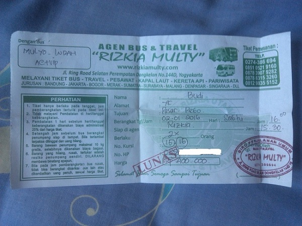 hingga akhirnya datang ke agen bus di kawasan dongkelan dan ditawari tiket bus PO Mulyo Indah..