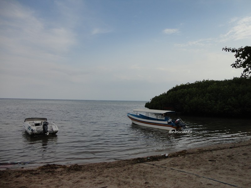 di sisi dekat tanaman bakau tertambat 2 perahu pengangkut wisatawan di pantai ini.. dirimu enek sik menambat oraย mblo? #ehh ๐