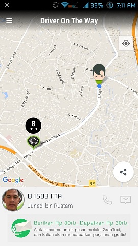 di perjalanan nbsusanto ngobrol dengan drivernya, menanyakan bagaimana sistem grab taxi ini, apakah bekerja sama dengan perusahaan taksi yang telah ada atau hanya drivernya yang terikat.. beliau berkata bahwa untuk perusahaan tempat beliau bernaung memang ada kerjasama dengan grab taxi sehingga order melalui grab taxi lebih mudah, memang ada driver yang secara pribadi bergabung dengan grab taxi untuk mendapatkan order walau bernaung di perusahaan taksi lain.. beliau pun bercerita bahwa dengan adanya aplikasi pemesanan online ini cukup memudahkan, bahkan beliau bilang memang sekarang sudah jarang orang naik taksi dengan melambaikan tangan karena hampir setiap orang kini telah memegang android.. selain itu karena bekerjasama dengan grab taxi, beliau mendapatkan bonus jika dalam sehari menyelesaikan jumlah order tertentu..