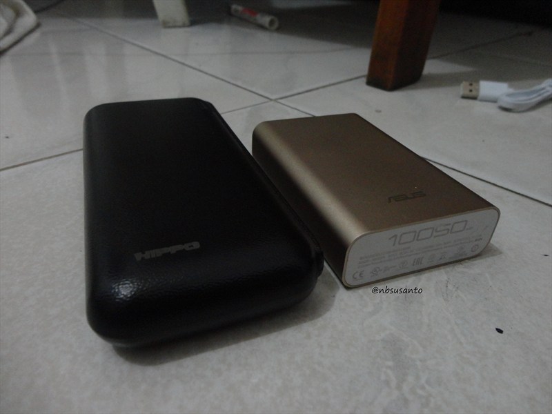 mengamati powerbanknya.. dibalut semacam softpad yang membuatnya terasa lebih elegan.. berhubung penasaran maka dibandingkan dengan asus zenpower 10050 mAh nbsusanto.. ukurannya sekitar 1,5x lipatnya.. proporsional dengan kapasitasnya..