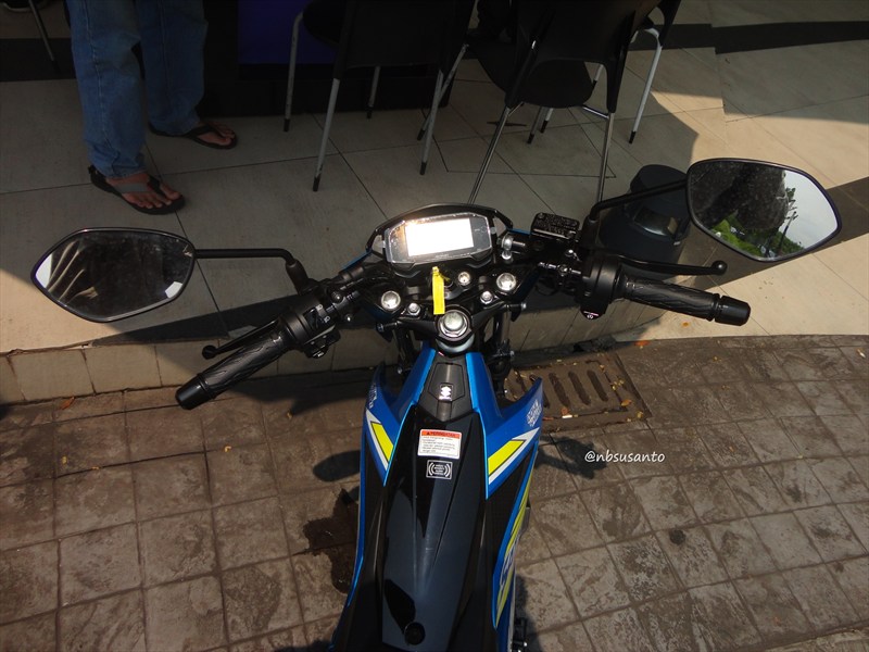 beralih ke sisi atas.. stang jepit dengan tangkai rendah khas satria.. dengan lampu yang sudah menganut AHO, dengan tombol yang ada standar berupa electric starter, klakson, saklar sein, saklar lampu dekat-jauh.. jangan lupa ada fitur secure key shutter khas kebanyakan motor jaman sekarang..