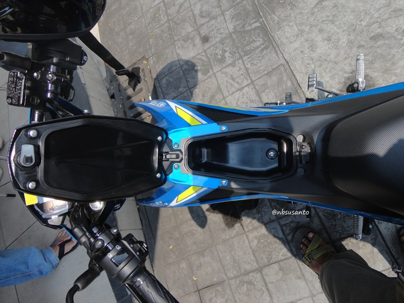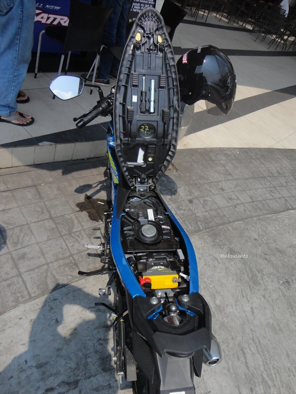 fitur baru di satria, yap ada bagasinya, mengingatkan pada cs1 saja dengan bagasi di depan.. ukuran bagasi cukup panjang walau tidak lebar dan tidak dalam.. ya setidaknya bisa untuk naruh jas hujan yang harus dilipet rapi banget dan beberapa toolkit, ya tentu daripada nggak ada!