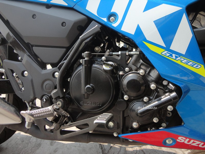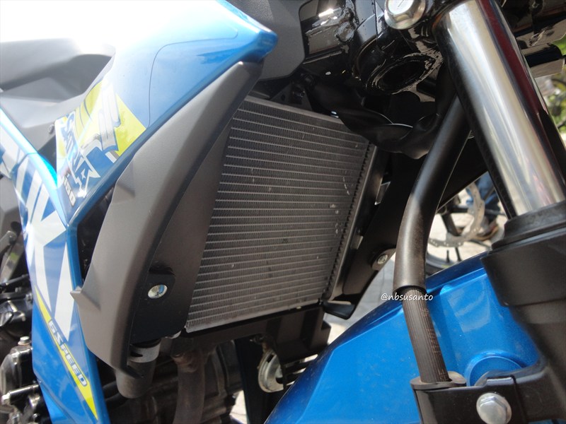 nah ini juga yang membedakan dengan satria lawas, dimana untuk versi karburator menggunakan oil cooler dan kapasitas oli mesin 1 liter.. nah untuk satria injeksi dengan perbandingan kompresi 11,5:1 ini menggunakan radiator sebagai pendingin dan kapasitas oli membengkak ke 1,3 liter! ayago jaman sekarang dagelan ya.. satria dan sonic kompresi di atas 11:1.. kemudian butuh lebih dari satu botol oli untuk penggantian berkala.. jadi apa karena bensin irit jadi butuh oli banyak? 😆