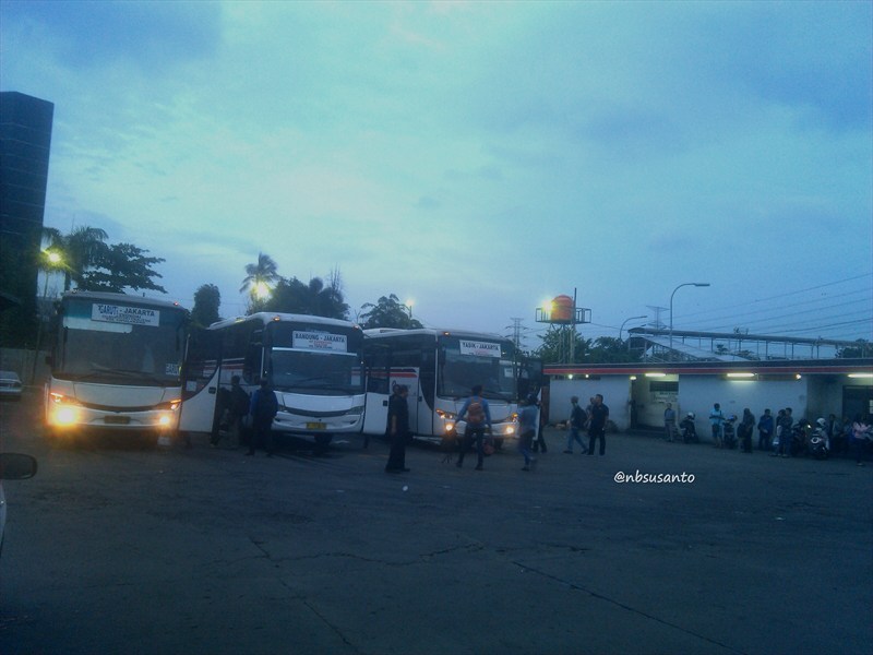 jalan 2 kilometer lah dari kantor.. sampai pool terlihat selalu ada 3 bus berjejer untuk diberangkatkan setelah penuh.. masing-masing jurusan jakarta-bandung yang hanya tersedia kelas ac bisnis, jakarta-garut dan jakarta-tasik yang kebetulan sore itu tersedianya ac ekonomi saja.. memang setiap bus stand by tak menunggu waktu lama sudah penuh dan berangkat.. pada pengumuman via pengeras suara, penumpang yang mau turun di cileunyi bisa naik bus tasik ataupun garut, tergantung yang mana dulu yang akan berangkat.. ya lumayan sekitar 2 jam nungguin si adit, jam 8 pas ada bus jurusan tasik langsung naik..