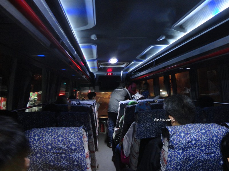 konfigurasi kursi 2-3.. saat itu nyari tuas reclining seat nggak ketemu, entah ada atau tidak.. yang pasti bangku sempit dan jarak depan belakang juga terbatas, cuma muat diisi ransel saja, kaki pun nbsusanto julurkan keluar berhubung nbsusanto yang duduk di dekat lorong.. oya, kondisi saat itu penuh bahkan ada beberapa penumpang yang berdiri.. untunglah dapat bus karena saat itu untuk jurusan lain ada yang sampe perlu mengambil nomor antrean karena bus belum masuk pool.. mau libur jadi banyak yang mau pulkam mungkin jadinya macet..