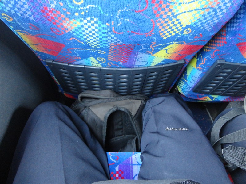 ruang kaki lega.. bisa untuk naruh ransel yang isinya penuh dan masih cukup untuk kaki tanpa tersiksa.. ya walaupun benar juga kata adit kalo seat sebelah kanan lebih lega ruang kakinya dibanding sebelah kiri.. ah ra nggagas.. yang penting bisa tidur.. tentu sambil berharap jalanan tidak macet dan bisa nyampe yogya setidaknya jam 1..