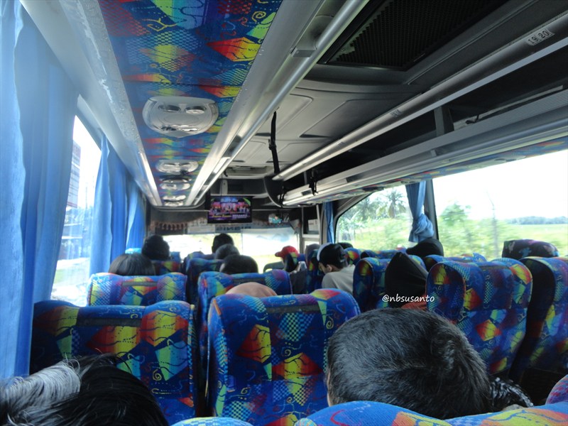 masuk juga di bus dengan konfigurasi jok 2-2.. bentuk joknya ada coakan di bagian kepala, seperti saat naik sinar jaya beberapa bulan sebelumnya.. reclining seat tentu tersedia.. yang pasti di bagian depan disuguhi layar tv dengan setelan dangdut koplo..