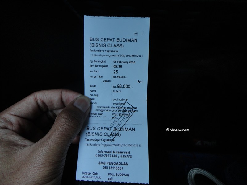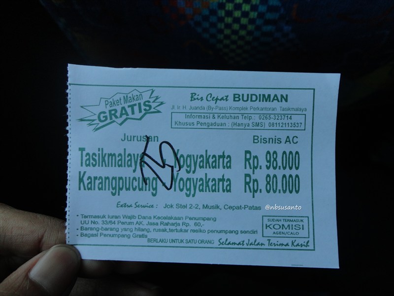 selepas sholat subuh langsung menuju ke bagian penjualan tiket seperti yang diarahkan oleh kru.. sudah 5.20an.. ternyata penjualan tiket terintegrasi online walaupun yang bisa mengakses adalah agen.. 98 ribu rupiah pun diserahkan untuk trayek tasik-yogya walaupun nbsusanto berencana turun di pertigaan toyan atau di sekitar terminal wates.. lumayan lah kalo naik budiman dari bandung ke yogyakarta tarifnya sekitar 120 ribu rupiah.. nah seat bagian kanan mepet kaca rata-rata sudah dipesan.. baiklah nbsusanto pun pilih yang kiri.. sekali-sekali lah..