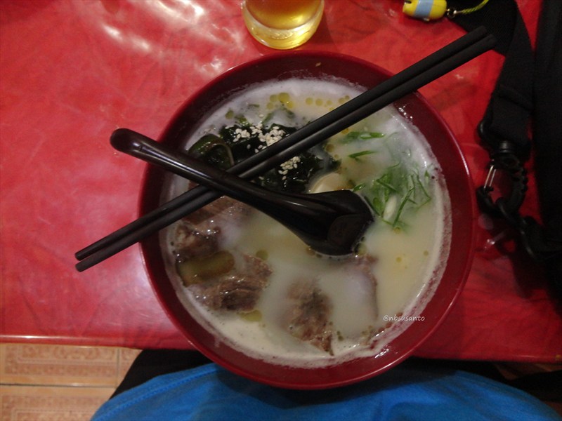 tak lama kemudian datanglah pesenan nbsusanto.. semangkok paitan ramen.. benar saja seperti yang dibilang tomi, paitan ramen ini menggunakan kuah yang tercampur susu.. terlihat dari warnanya.. memang terlihat berbeda dengan ramen yang nbsusanto pernah nikmati di yogyakarta dulu.. ah daripada kelamaan langsung diaduk dan disikat.. 😆