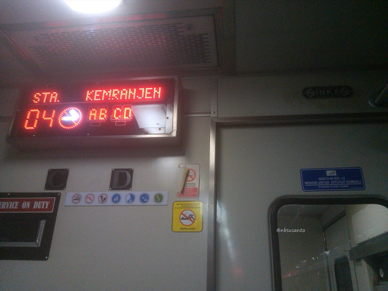 satu hal yang menarik adalah papan informasi digital di kereta jaka tingkir ini selalu diupdate, jadi pada saat kereta berjalan tulisannya himbauan untuk menjaga barang bawaan, pada saat memasuki stasiun tertentu pun tertulis bahwa kereta memasuki stasiun tersebut, saat berhenti tulisan berganti hanya nama stasiun, kemudian saat mulai berjalan tulisannya berubah menjadi meninggalkan stasiun persinggahan tadi.. apik meskipun jika ada jam digitalnya bakalan lebih informatif.. hanya saja sayangnya nbsusanto tidak mendengar informasi dengan speaker di dalam kereta bahwa kereta akan masuk stasiun, atau nbsusanto yang kurang memperhatikan saja ya? soalnya seingetnya cuma denger pengumuman dari stasiun persinggahan.. ya namanya kereta ekonomi pasti berkali-kali singgah lah.. :mrgreen: