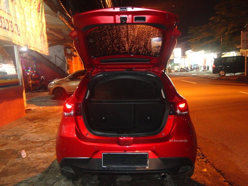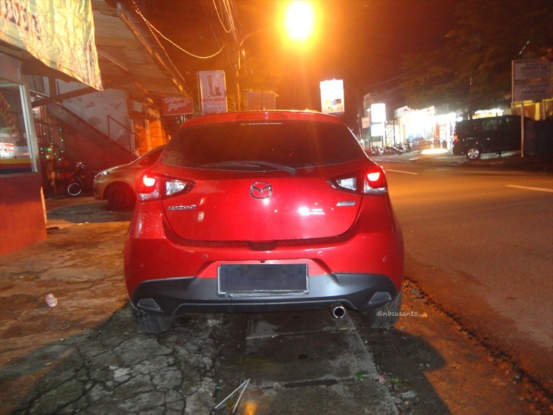 tampilan belakang mazda 2 gt pun cukup simpel.. satu hal yang nbsusanto sukai adalah sampe sisi ini pun tak ada hiasan chrome seperti kebanyakan mobil baru di indonesia saat ini.. cukup emblem mazda, tulisan mazda2 serta logo skyactiv.. sementara itu wiper belakang adalah standar dan terdapat lampu rem di sisi atas kaca belakang.. untuk seri R dan GT terdapat ekstensi muffler.. tentu saja terdapat sensor parkir 4 titik dan kamera mundur..