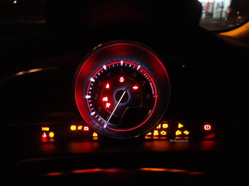 kalo ini panel instrumen all new mazda2 gt saat dinyalakan dan posisi sudah siap.. tachometer analog dan indikator lain yang digital serta tak ketinggalan ada MID nya.. terlihat bukan banyak lampu indikator yang menyala saat tombol start-stop ditekan.. well.. warna yang diberikan cukup adem.. nah kalo misal dirasa kesulitan mengintip angka digital speedometer di cluster meter saat jalan santai saja, di atasnya akan muncul HUD yang menunjukkan angka speedometer yang mudah sekali dilihat oleh driver maupun penumpang baris kedua..