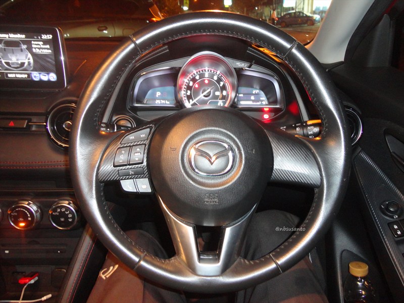 oya, tentu terdapat tombol start-stop engine serta beberapa tombol pengaturan tsc.. oya, all new mazda2 juga sudah dilengkapi dynamic stability control serta hill launch assist.. kalo airbag memang sudah jadi standar mobil masa kini.. nah, sistem kemudi didukung oleh sistem electronic power assist steering..
