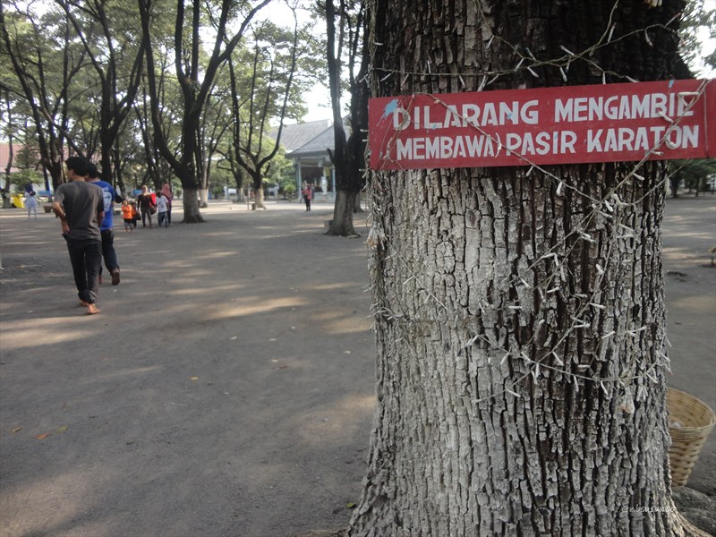 di sisi timur, tepatnya di teras bangunan terdapat tali dan tulisan larangan melintas.. duduk pun tak boleh.. ya bagian pengunjung hanya di bagian berpasir saja.. oya seperti di foto sebelumnya, dilarang untuk mengambil pasir di kawasan ini..