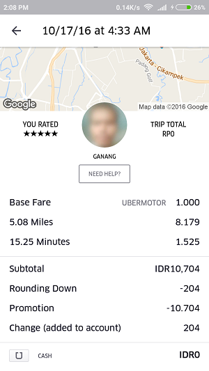 perjalanan ba’da subuh tidak ada yang istimewa.. jalanan masih cukup sepi.. cukup cepat sampai tujuan dan begitu sampai, si driver belum tau kalo nbsusanto menggunakan kode promo.. beliau mengecek tarif, ya karena memang untuk uber tarifnya tidak fix seperti gojek atau grab melainkan menggunakan range meskipun kisaran harga masih sama, dan yang seharusnya dibayarkan 10704 didiskon 204, yaitu 10500, namun telah dicover oleh free ride sebesar 25000 yang nbsusanto miliki.. lumayaan.. 😀