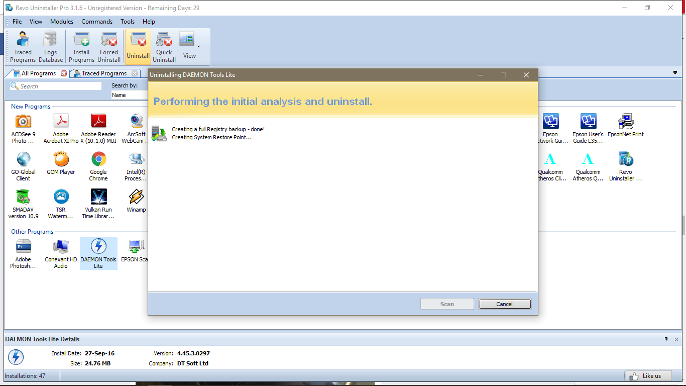 tapi berhubung cari yang praktis akhirnya mencoba dulu menggunakan revo uninstaller.. pilih daemon tools lite lawas.. ada pilihan uninstal dan force uninstal.. nbsusanto coba dulu dengan uninstal biasa dan jika gagal baru menggunakan force uninstal.. tunggu proses analisis dan uninstal.. ternyata bisa dan lancar jaya.. daemon tools versi lawas sudah hilang.. akhirnya..