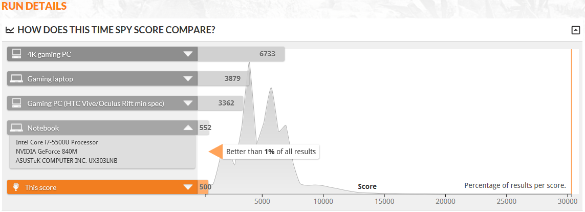 awalnya melihat perbandingan dengan device lain juga kaget, mosok sehancur ini? tapi setelah liat spek yang nilainya sedikit di atasnya baru ngeh, lha yang pake i7-5500u + nvidia 840m saja segitu apalagi ini yang cpu di bawahnya..