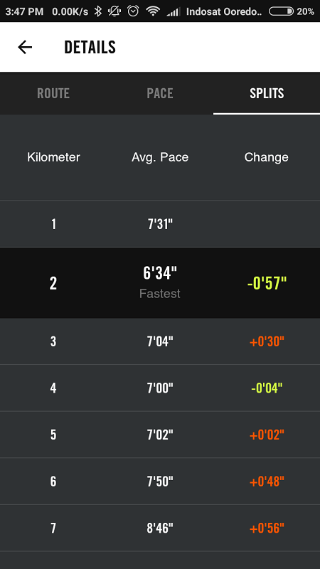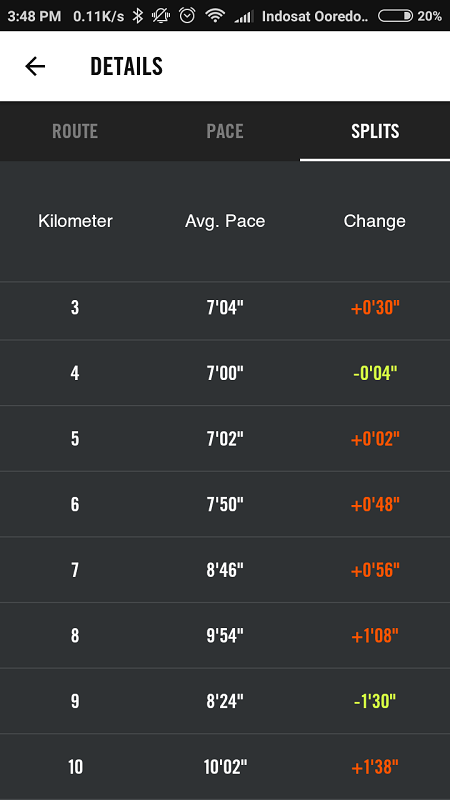 tampak waktu yang tercatat juga sekitar 80 menit karena catatatn start 5.31 dan finish 6.48, saat 6.48 sudah jalan setelah finish.. terlihat lari total setengah waktu perjalanan saja.. oya catatan kilometer di mi band 2 adalah perkiraan dari jarak setiap langkah karena tidak ada gps.. bahkan di akhir masih tercatat sebagai fast walking karena lari langkah panjang memang langkahnya tak sebanyak lari biasa, dengan tenaga tersisa.. di grafik nike+ run club juga pace dari belasan menit karena jalan kaki tiba-tiba melonjak di kecepatan parsial 6 menit per kilometer..