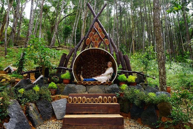 di wisata alam seribu batu songgolangit ini ada sebuah sudut yang berupa amfiteater, dengan titik pementasan di sebuah panggung bundar yang disusun dari tatanan kayu dan di sekelilingnya bangku penonton terbuat dari pasangan kayu juga.. mantep wis.. nggak tau sih biasanya untuk pementasan apa, saat itu ada beberapa kursi kayu di atas panggung..