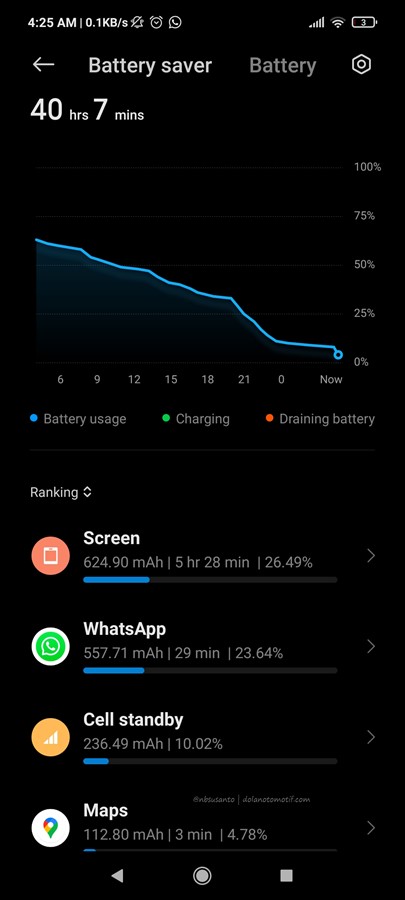 baterai yang digunakan pada Poco X3 Pro ini besar.. di hari-hari pertama, daya tahan baterai untuk penggunaan game normal tidak jauh berbeda dengan Asus yang telah berusia 2 tahun.. mungkin kalau penggunaan normal bukan gamers bisa lebih awet.. namun data penggunaan baterai meskipun masih fluktuatif karena selanjutnya menjadi kuat lebih dari 1,5 hari padahal sering main NFS No Limits tapi jarang membuka browser..