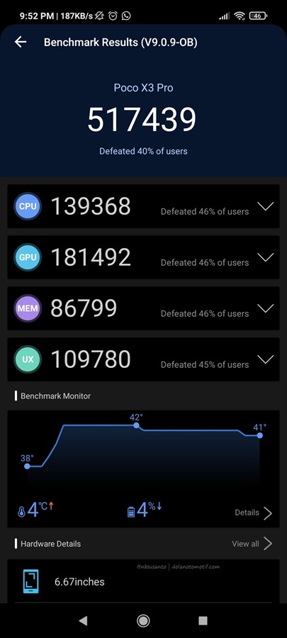 yang selanjutnya dicoba adalah……. ngegame dan benchmark.. performa Poco X3 Pro tidak perlu diragukan lagi.. bermain NFS No Limits dan Asphalt 9 sangat lancar dan memuaskan dengan grafis yang bagus.. hanya mungkin untuk main Asphalt 9 dalam jangka waktu agak lama hp Pocophone X3 Pro menjadi lebih hangat.. namun tidak ada fungsi yang berkurang.. paling baterai yang cepat berkurang saja.. oya Asphalt hanya selingan, NFS No Limits adalah game yang jauh lebih sering nbsusanto mainkan.. untuk game FPS nbsusanto tidak bisa berkomentar karena memang bukan genre yang nbsusanto minati.. 😅